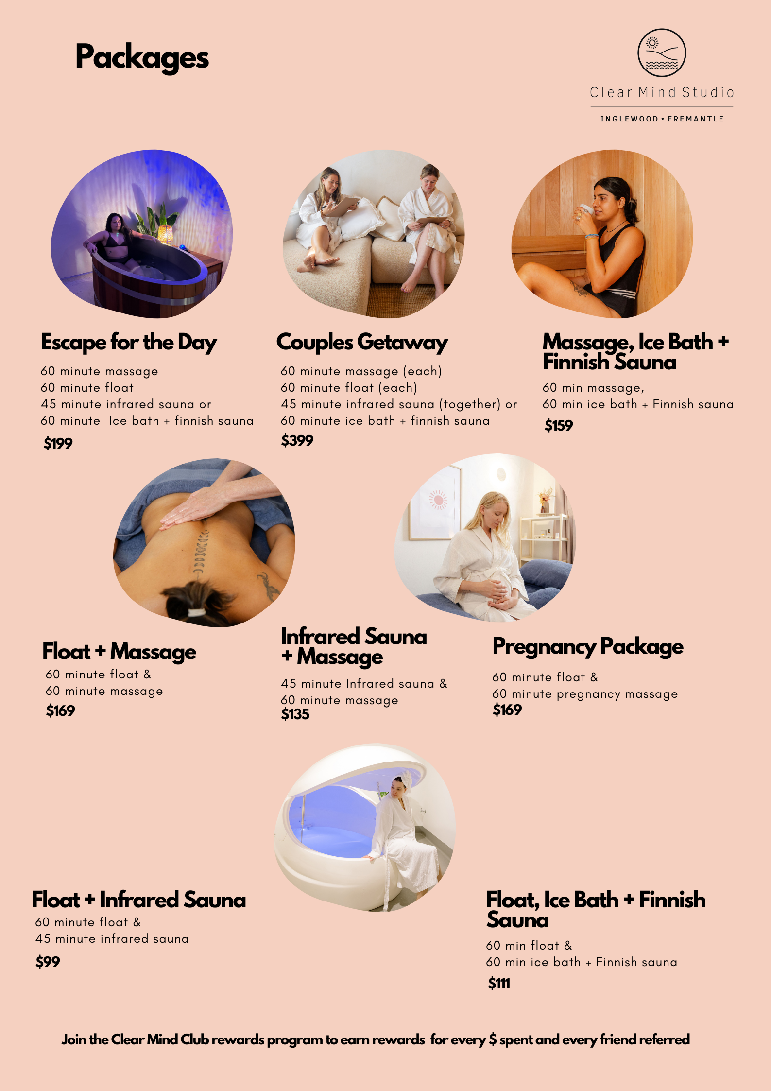 We specialise in private, spa-like experiences that are as effective as they are relaxing. Whether you’re looking to float weightlessly in a float pod, detox in a Finnish or infrared sauna, build stress resilience with an ice bath, or melt tension away with a massage, Clear Mind Studio is your destination for total rest and rejuvenation.