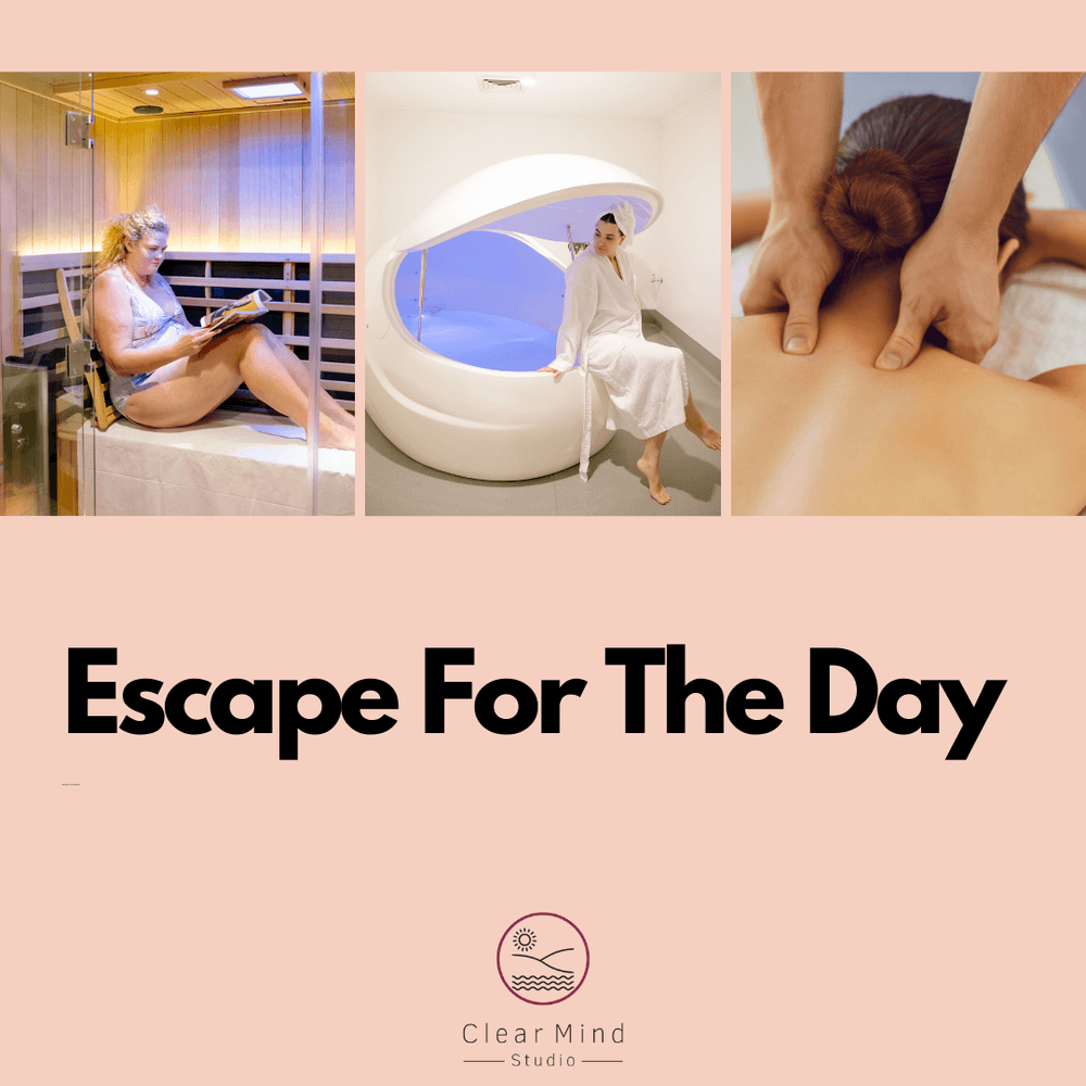 Escape For The Day package at Clear Mind Studio with float, massage and sauna or ice bath for full-body relaxation